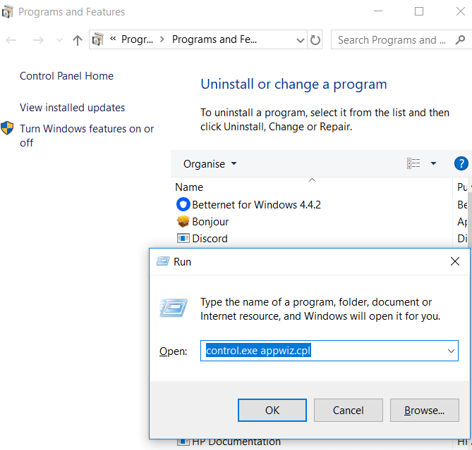 Sie können schnell auf die Seite zugreifen. Programmfunktionen Aus dem Bedienfeld heraus 'control.exe appwiz.cpl' im Wiedergabefeld.