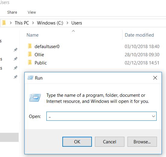 Ein weiterer Befehl, der der oben genannten Option für das Laufwerk C ähnelt, beinhaltet die Eingabe '..' Im Dialogfeld „Ausführen“ gelangen Sie zum Benutzerordner Ihres Windows 10-Computers. Von dort aus können Sie schnell auf die ausgewählten Benutzerdateien zugreifen.