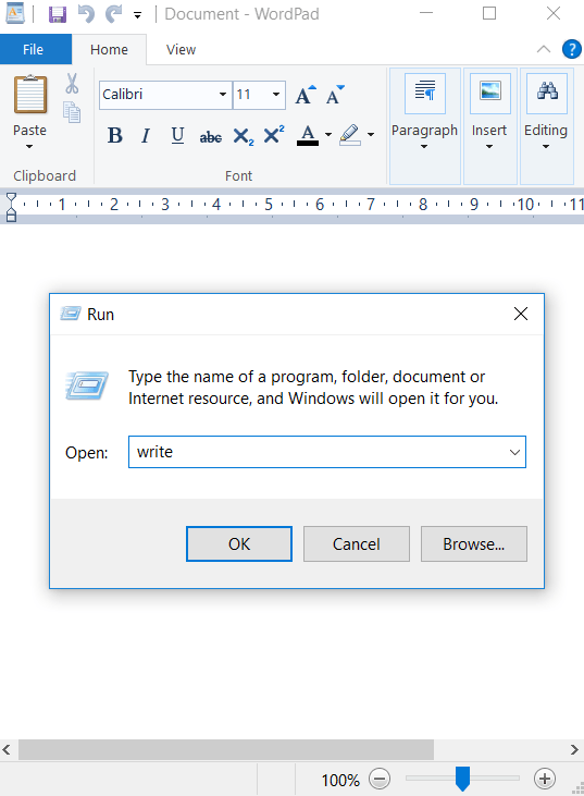Wenn Sie schnell etwas notieren möchten, können Sie das Ausführen-Feld verwenden und schreiben „schreiben“. Danach, Drücken Sie Enter Sie werden zu WordPad weitergeleitet.